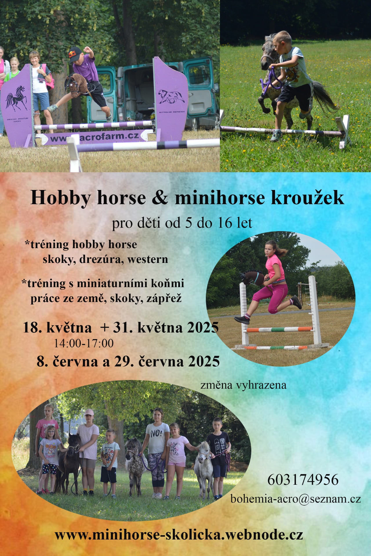 HOBBY HORSE a MINIHORSE kroužek pro děti od 5 do 16 let. Pokud máte zájem volejte předem aby jste se zapsali do kroužku. Cena za měsíc ( dvě výcvikové odpoledne včetně všech pomůcek , překážek, půjčení hobbyhorse, půjčení našich koní atd. ) je 1000 Kč. Pracujeme s malou skupinou, děti si odpoledne určitě užijí.